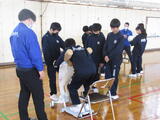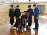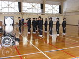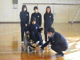 1年生がノーマリー教室の学習で介護ロボット体験を行いました。体育館を会場にして、4つのグループに分かれそれぞれの介護ロボットを順番に体験します。電動車椅子や介護用のベッド、人を癒やす赤ちゃんや犬、アザラシ型のロボットなど、生徒たちは興味深そうに参加していました。どれも使いやすいようによく工夫されていて、ロボット技術の高さを実感しました。高齢者や体の不自由な人が快適に生活できる社会のために、これらの普及がもっと進むことを願っています。また、今回の体験を進路選択でもぜひ参考にしてみてください。
